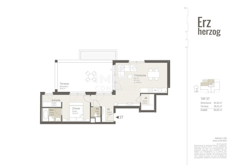 Der großzügige Wohnbereich bietet genug Platz für individuelle Gestaltungsmöglichkeiten und Wohnkomfort. Die möblierte Küche ist perfekt auf die Bedürfnisse des modernen Lebens abgestimmt. Ein zusätzlicher Komfort ist das Gäste WC, welches diese exquisite Wohnung abrundet. 26 m² Dachterrasse bietet großzügig viel Raum für Erholung.