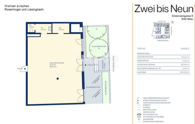 Die Lage des Projekts bietet das Beste aus beiden Welten: Die lebendige Stadt ist nur einen Katzensprung entfernt, während die umliegenden Grünflächen und der Liesingbach zum Durchatmen und Entspannen einladen. Zahlreiche Nahversorger wie Supermärkte, Drogerien und Apotheken befinden sich nur wenige Schritte entfernt, und auch ein Kindergarten liegt in unmittelbarer Nähe. Für kulinarische Genüsse sorgen namhafte Weingüter, Heurige und Gasthäuser während das Einkaufszentrum Riverside eine Vielzahl an Einkaufs- und Freizeitmöglichkeiten bietet. Sport- und Naturbegeisterte finden im Liesingbachgebiet und im neu geschaffenen Stadtpark Atzgersdorf ideale Orte für Spaziergänge, Laufrunden und Erholung. Selbst das beliebte Liesinger Bad ist mit dem Fahrrad in weniger als zehn Minuten erreichbar. Der nahegelegene Autobus bringt Sie in nur 13 Minuten nach Hietzing, und der Schnellbahn-Bahnhof Atzgersdorf ist lediglich eine kurze Spazierstrecke oder eine zweiminütige Busfahrt entfernt. Von dort aus erreichen Sie die zentralen Verkehrsknotenpunkte Wien Meidling und Wien Hauptbahnhof in nur sechs bzw. zwölf Minuten. Diese gute Anbindung macht das Projekt zur idealen Basis für ein urbanes Leben im Grünen – auch ohne eigenem Auto!Beschreibung der Immobilie