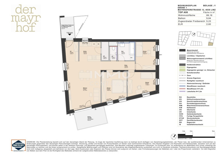 Das Projekt G r ü n G e b o r g e n befindet sich am ruhigen Rand des Linzer Stadtteils Neue Heimat, eingebettet in eine angenehme Wohngegend. In einer Sackgasse ohne Durchzugsverkehr gelegen, bietet die Adresse ein hohes Maß an Privatsphäre und Lebensqualität. Direkt angrenzend erstreckt sich eine Einfamilienhaussiedlung, in unmittelbarer Nachbarschaft befinden sich gepflegte Schrebergärten – ein Bild von Ruhe und naturnahem Wohnen. Im näheren Umfeld sorgen einige Gewerbebetriebe sowie der Maximarkt als Nahversorger für kurze Wege im Alltag. Ein besonderes Highlight ist die Nähe zur Traunau, einem geschützten Naturparadies, das nur wenige Minuten entfernt liegt. Die weitläufige, naturbelassene Aulandschaft lädt zu Spaziergängen, Joggingrunden oder Radtouren ein – über schmale, reizvolle Pfade mitten durch die grüne Oase. Auch in puncto Mobilität ist das Projekt G r ü n G e b o r g e n gut angebunden: Die Bushaltestelle Baintwiese befindet sich direkt beim Wohnprojekt und bietet Anschluss an den Stadtverkehr sowie Schnellbuslinien. Wer lieber mit dem Zug unterwegs ist, erreicht den Bahnhof Linz-Wegscheid in rund 15 Gehminuten.Beschreibung der Immobilie