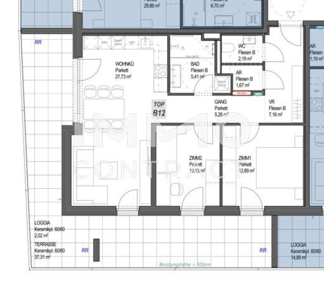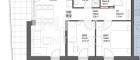 Raumaufteilung: Vorraum, WC, Abstellraum, Bad, 2 Schlafzimmer, Wohn-Essküche (Küche nicht möbliert, Anschlüsse vorhanden), Terrasse/Loggia.