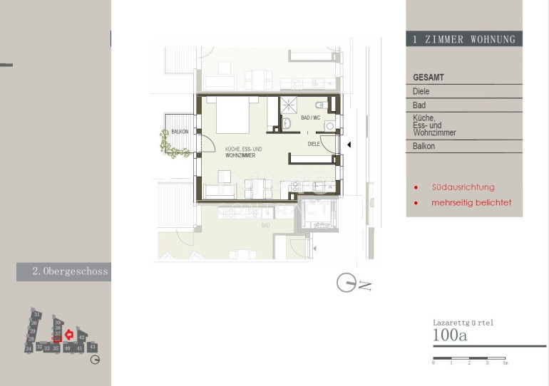 Diese ca. 36,82 m² große, geförderte Ein-Zimmer-Wohnung befindet sich im 2. Stock am Lazarettgürtel 100a.