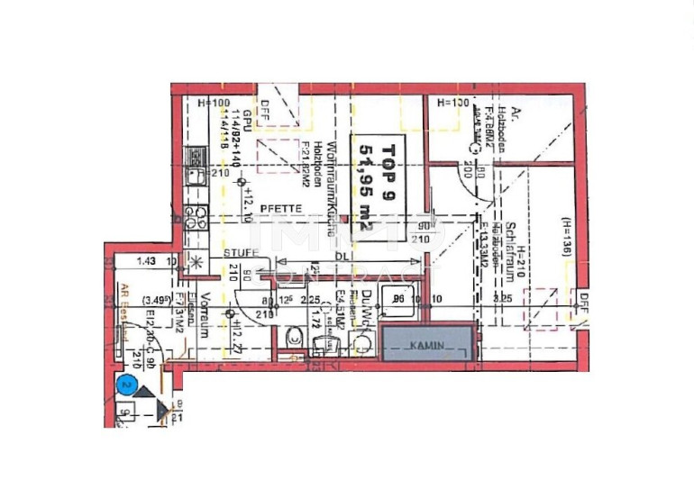 Raumaufteilung: Vorraum, Wohnküche, Schlafzimmer, Schrankraum, Bad/Toilette.