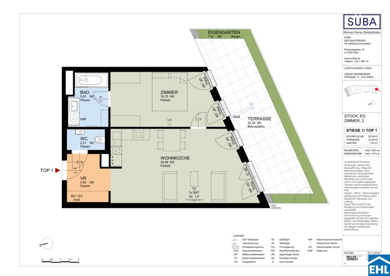 Diese optimal geschnittene 2-Zimmerwohnung liegt im Erdgeschoss und unterteilt sich in ein geräumiges Wohnzimmer mit Küchenzeile, ein separat begehbares Schlafzimmer, ein Badezimmer mit Wanne und Waschmaschinenanschluss, ein separates WC, sowie einen Vorraum. Zudem verfügt die Wohnung über südseitigen Eigengarten mit großer Terrasse!