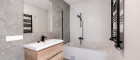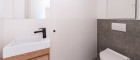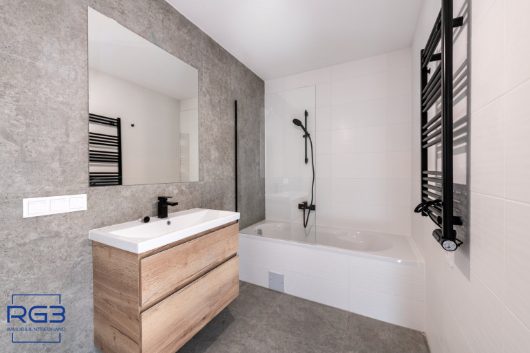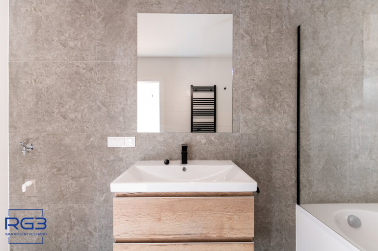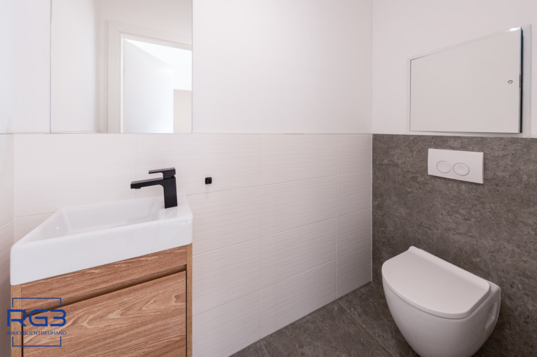 Mit dem Lift fahren Sie bequem in den ersten Stock. Sie betreten die Wohnung und spüren sofort: alles ist neu, alles ist ruhig, alles passt zusammen. Rechts befindet sich ausreichend Platz für Garderobe und Jacken. Links liegt das moderne Badezimmer mit extra Toilette, klar gestaltet, hochwertig ausgeführt.
