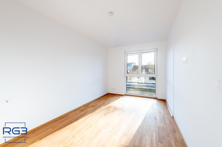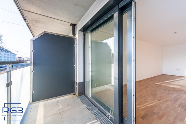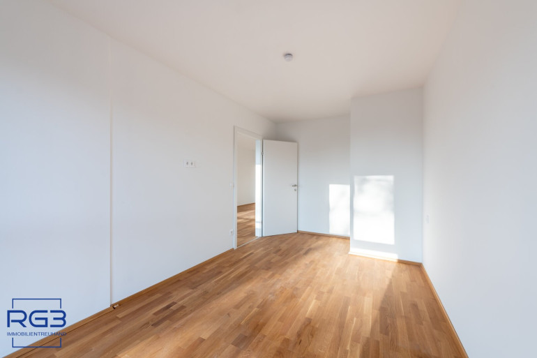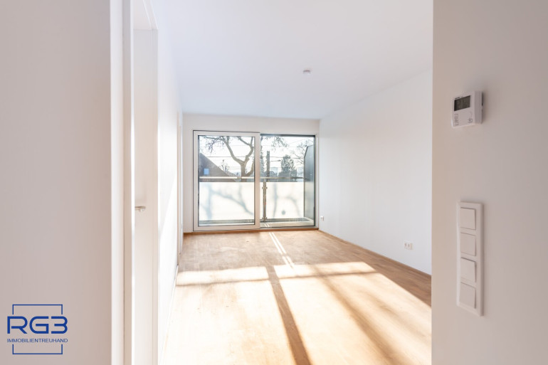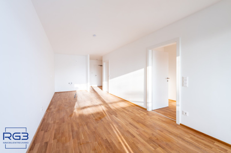 Geradeaus öffnet sich der Wohnbereich. Hier geht der Küchenraum fließend in das großzügige Wohnzimmer über. Der Raum ist angenehm geplant, hell und sehr gut möblierbar. Vom Schlafzimmer gelangen Sie direkt auf die Loggia mit einem wunderbaren Blick in den Südwesten Richtung Alte Donau, zu der Sie nur ca. 170m Gehweg haben.