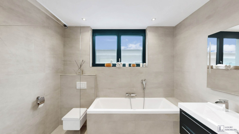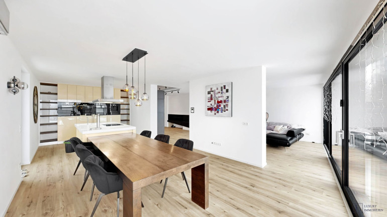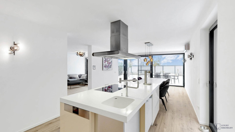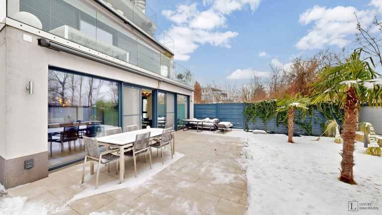 Die Wohnung vereint modernen Wohnkomfort mit großzügigen, privaten Bereichen. Helle, weitläufige Räume gehen nahtlos in den eigenen Garten über und schaffen ein Gefühl von Freiheit und Entspannung. Große Fensterfronten sorgen für viel Tageslicht und bieten einen beeindruckenden Blick auf die Donau und die Skyline Wiens.
