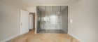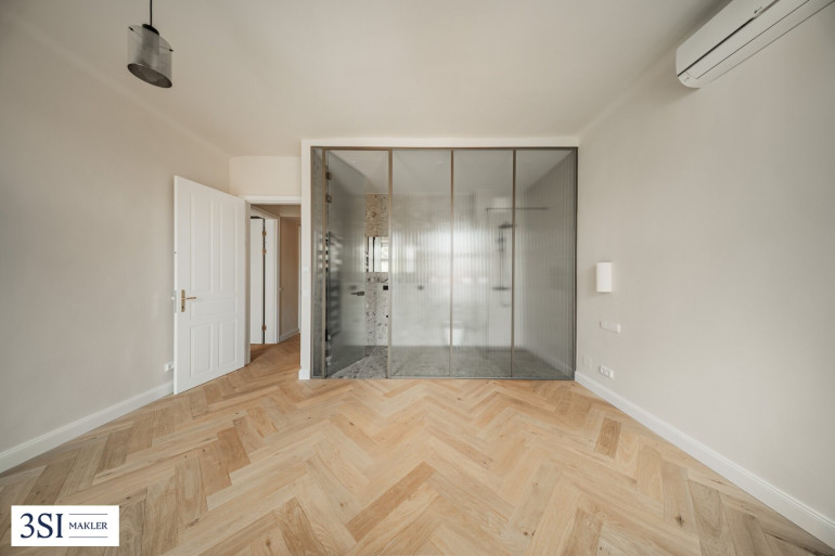 Master-Bedroom (ca. 18 m²) mit en suite-Badezimmer, abgetrennt durch eine stilvolle Glaswand, ausgestattet mit Dusche und WC, sowie direktem Zugang zum Nordwest-Balkon mit Blick Richtung Karlskirche.