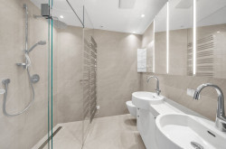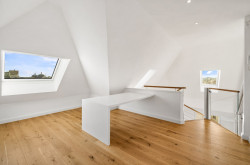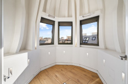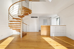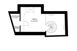 In der von außen als Turm erkennbaren Loggia wurde das Gefühl von freiem Raum geschaffen: Diese Besonderheit kann sowohl gekühlt, beleuchtet als auch beheizt werden und ist ein seltenes Highlight für solch eine Traumwohnung. Das geräumige Schlafzimmer und Bad mit wohltuender Regendusche befinden sich ebenfalls auf dieser Ebene. Über eine stilvolle und freistehende Wendeltreppe im Wohnbereich gelangt man auf eine über 20m² große Galerieebene, in der ein maßverarbeiteter Schreibtisch beste Voraussetzungen für ein Home-Office oder eine Bibliothek als gemütlichen Rückzugsort bietet.