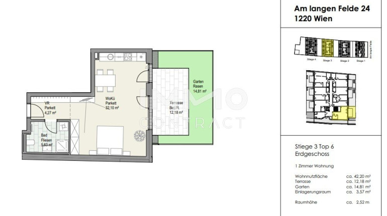 Die fertiggestellten Eigentumswohnungen Am Langen Felde 24 liegen in ausgezeichneter Lage der Donaustadt – nur wenige Minuten von der U1 Kagraner Platz entfernt. Die Umgebung verbindet urbanen Komfort mit naturnaher Erholung: Alte Donau, Lobau, die Blumengärten Hirschstetten und der Badeteich Hirschstetten bieten zahlreiche Freizeitmöglichkeiten im Grünen. Sämtliche Nahversorger, Schulen, Kindergärten und Ärzte sind fußläufig erreichbar. Das nahegelegene Donauzentrum und die hervorragende öffentliche Anbindung sorgen für beste Infrastruktur. Der 22. Bezirk zählt zu den aufstrebendsten Wohngegenden Wiens – eine Wohnung hier steht für hohe Lebensqualität und eine wertbeständige Investition.Beschreibung der Immobilie