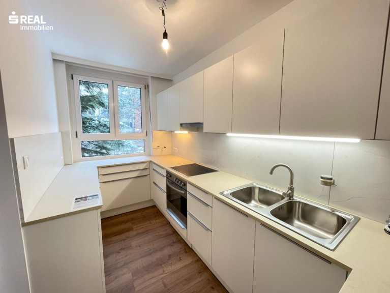 Parkett, Fliesen, Laminatboden, Zentralheizung, Einbauküche, Westbalkon, Dusche