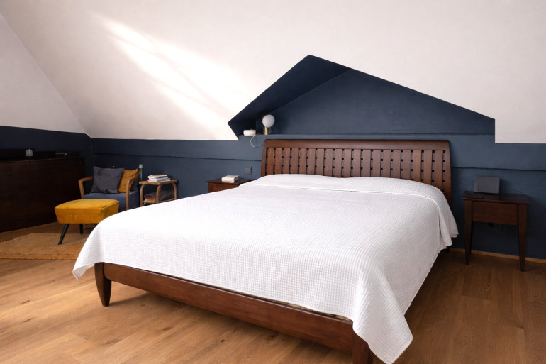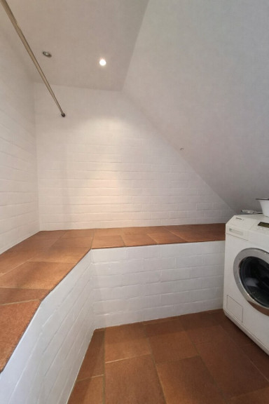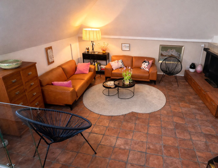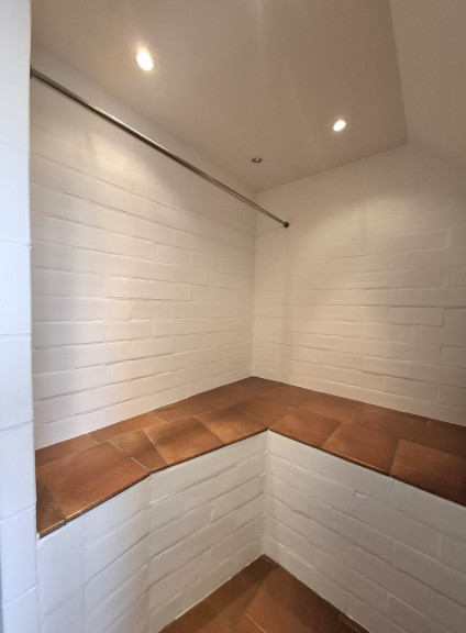 In Kombination mit dem handverlegten Terrakotta-Boden aus den Originalfliesen des alten Brandbodens, der dem Interieur Wärme, Tiefe und Authentizität verleiht, entsteht ein Wohngefühl, das an südliche, mediterrane Häuser erinnert. Der Boden prägt den Charakter der Wohnung maßgeblich: Seine natürliche Struktur, die warmen Farbtöne und die sichtbare Patina stehen für den Stil Terrakotta – Rustic – Mediterranean und verleihen den Räumen eine zeitlose Eleganz.