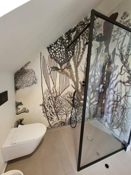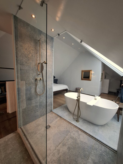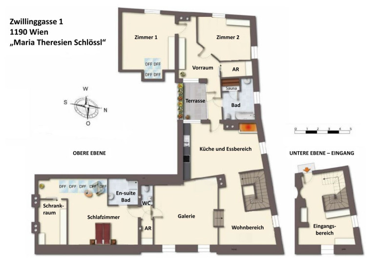 Das obere en-suite Bad bietet neben der Dusche eine freistehende Designer-Badewanne und wird von einem neuen 200-Liter-Elektrospeicher von Austria Email versorgt. Eine besondere Rarität stellt das Tepidarium im unteren Bad dar, das dem Wellness-Charakter der Wohnung eine außergewöhnliche und exklusive Note verleiht.