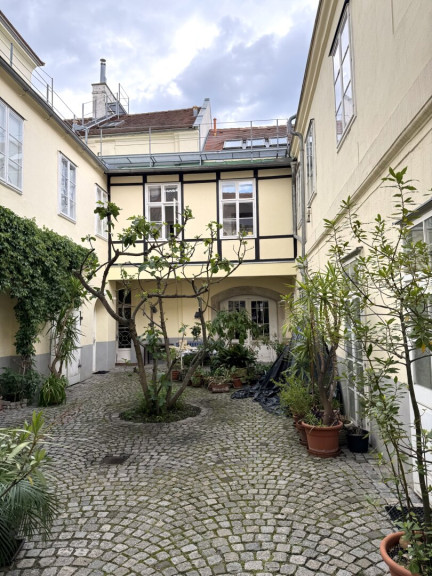 Der romantische, historisch geprägte Innenhof als Allgemeinfläche umfasst ca. 120 m² und bietet zusätzlichen Freiraum. Ergänzt wird dieser durch einen großzügigen Gemeinschaftsgarten mit ca. 360 m², der die grüne Wohnqualität des Hauses unterstreicht.