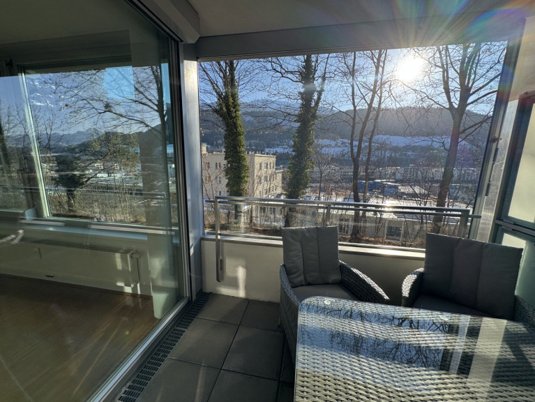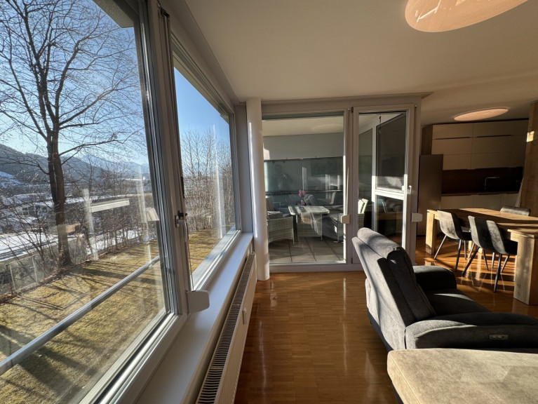 Das Herzstück der Wohnung ist die einladende Loggia, die Ihnen nicht nur einen herrlichen Ausblick auf die umliegenden Berge bietet, sondern auch ein perfekter Ort ist, um die ersten Sonnenstrahlen des Tages zu genießen oder den Abend bei einem Glas Wein ausklingen zu lassen. Diese kann mittels Rollo auch komplett geschlossen werden.