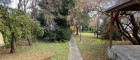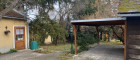 Sonniger Garten mit altem Baumbestand, Terrasse und Holzschuppen