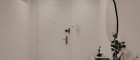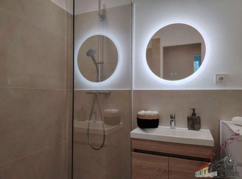 Das moderne Badezimmer ist mit einer bodengleichen Dusche ausgestattet und überzeugt durch klare Linien und hochwertige Materialien.