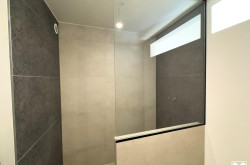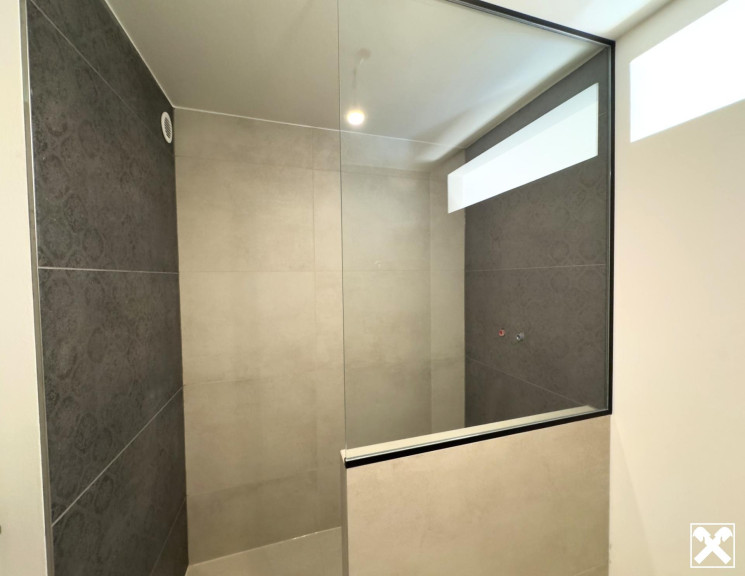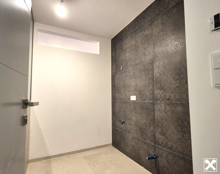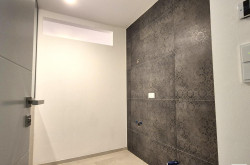 Vom Vorraum sind auch ein tolles Badezimmer mit großer bodenebener Dusche sowie das WC zugänglich.