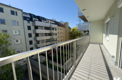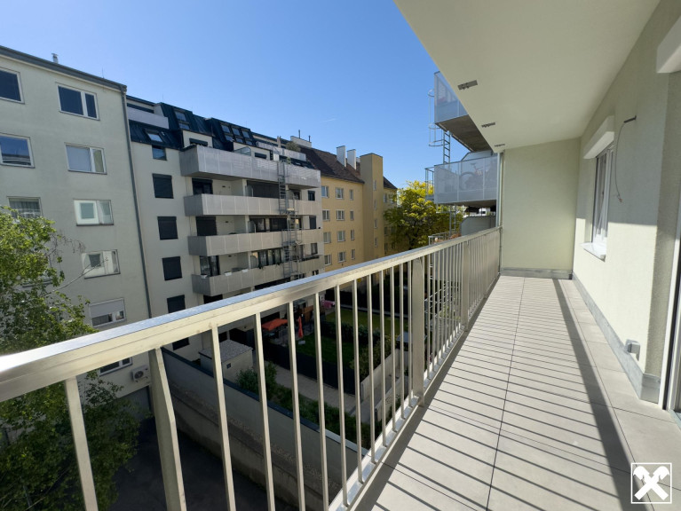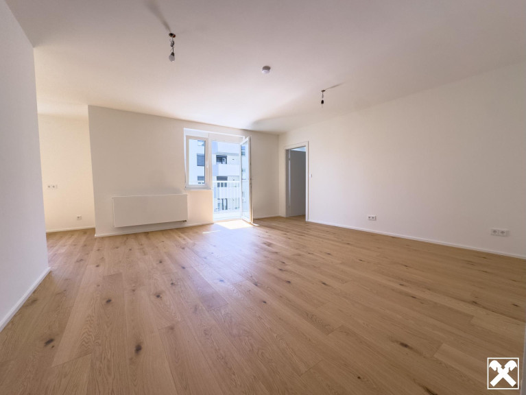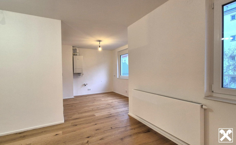 Der sehr helle Wohnraum öffnet sich zum ca. 10 m² großen in den Innenhof orientierten Balkon und zu einem großzügigen Küchenbereich.