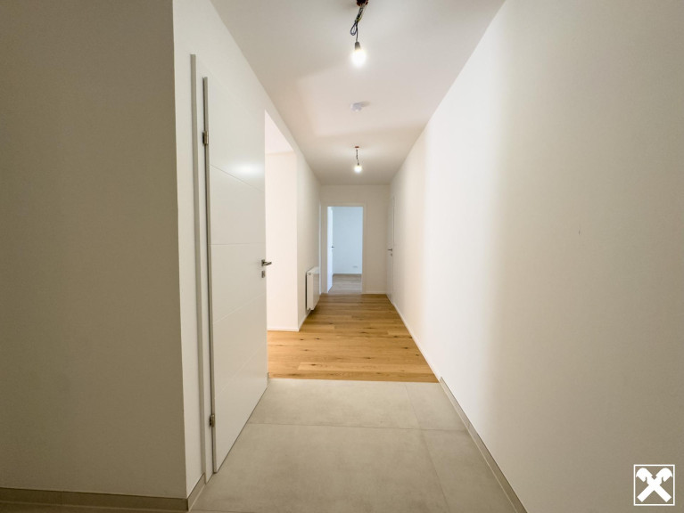 An das Wohnzimmer anschließend befindet sich eines der Schlafzimmer, ein weiteres Schlafzimmer sowie in Abstellraum sind vom Vorraum aus erreichbar.