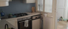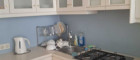 Nach rechts geht's zum zweiten Bereich, zuerst in eine Küche, die modern verbaut und voll ausgestattet ist. Durch das original erhaltene Gangfenster zum Vorraum hat sie ein ganz besonderes Flair. Der nächste Raum ist das Wohnzimmer mit einer durchgängigen Fensterfront zur Straße. Diesen Bereich würde ich als einen klassischen Altbau-Raum bezeichnen: groß, hell und mit sehr viel Charme. Weiter geht es in einen kleinen Durchgangsraum, der aktuell als Gästezimmer Verwendung findet, zu einem schönen Bad mit Dusche und gesonderter Toilette.