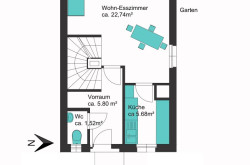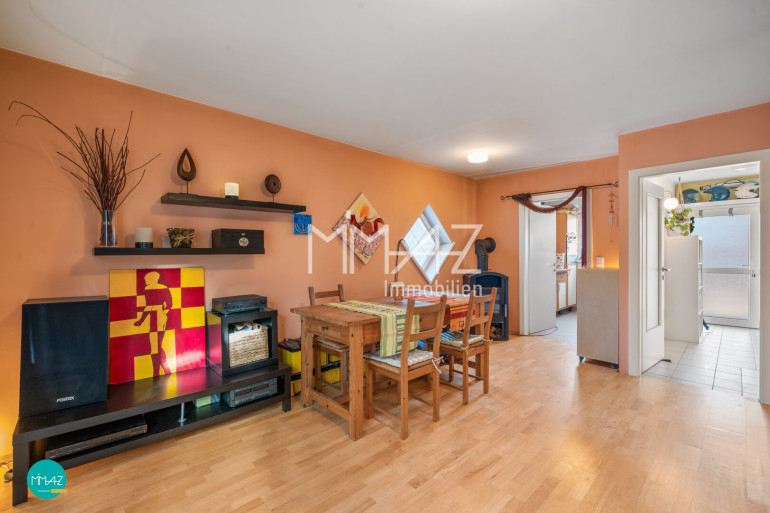 Das Herzstück bildet das Wohnzimmer im Erdgeschoss mit direktem Ausgang auf die Terrasse und in den ca. 315 m² großen Eigengarten - ein Ort für Frühstück in der Sonne, spielende Kinder und entspannte Grillabende.