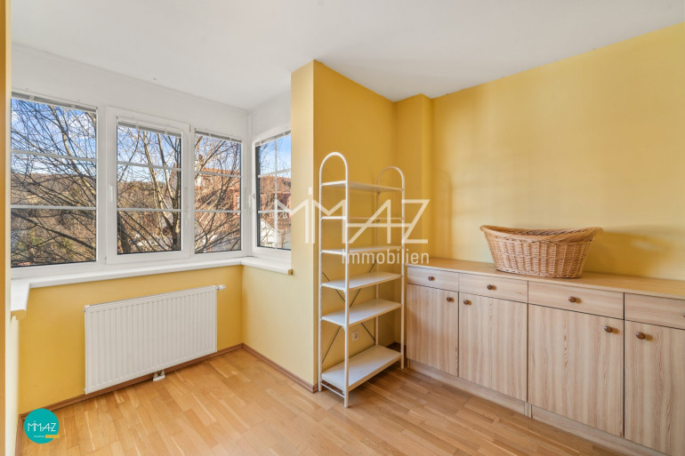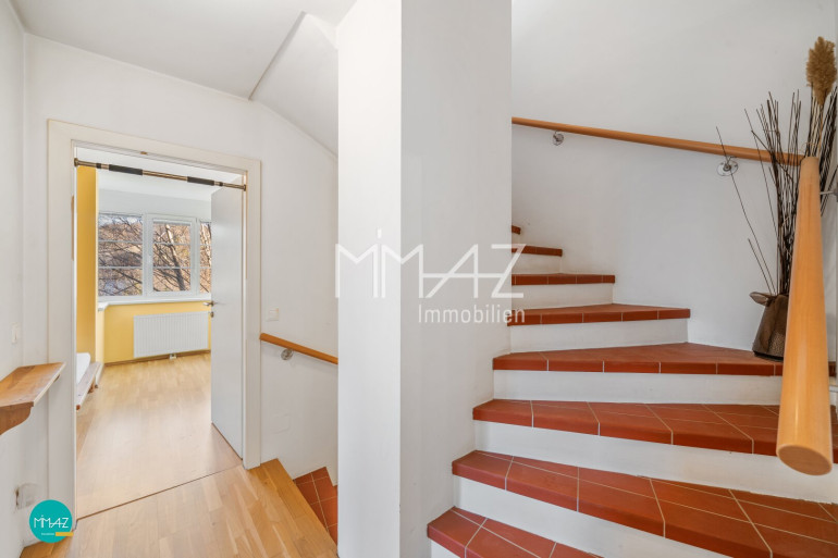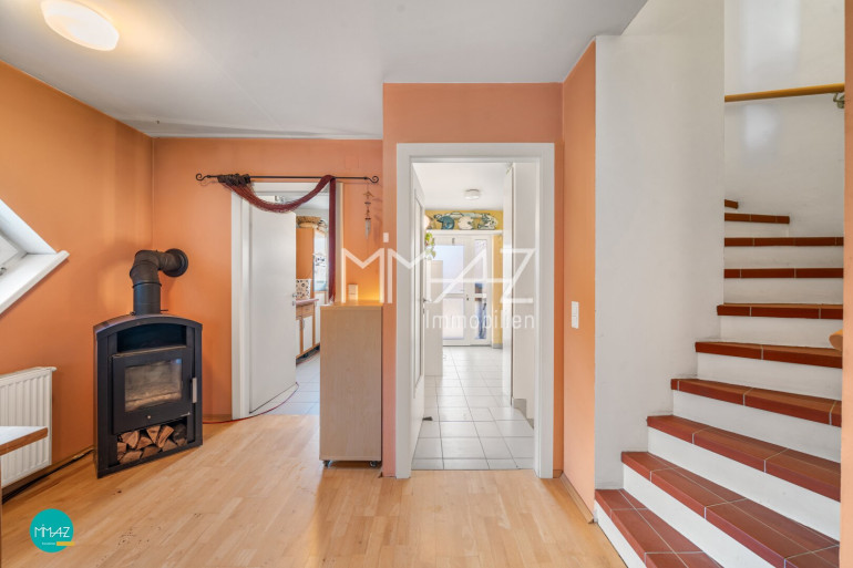 Die angrenzende Küche, die bei Bedarf auch geöffnet und in eine große Wohnküche umgebaut werden könnte, sowie ein Vorzimmer mit Garderobenbereich und eine separate Toilette mit Handwaschbecken ergänzen diese Ebene zu einem harmonischen Wohnbereich.