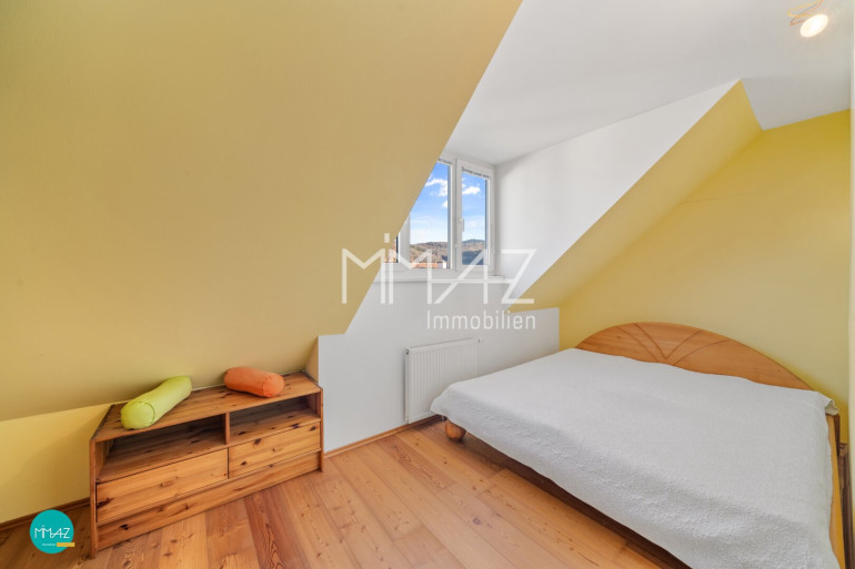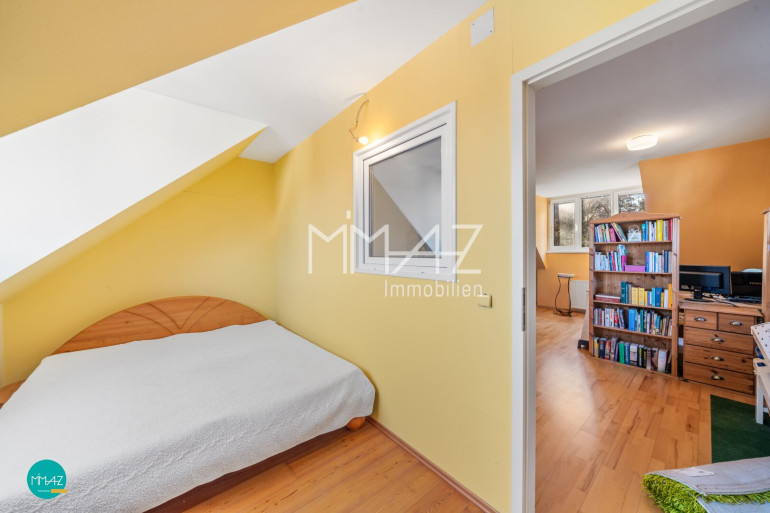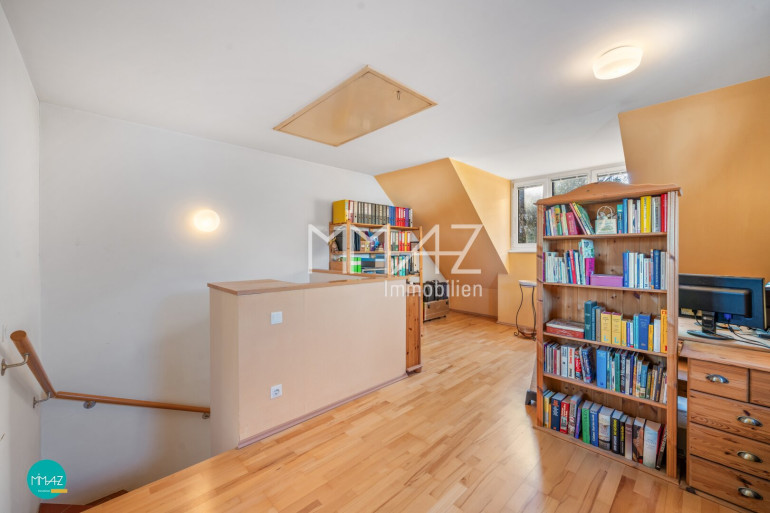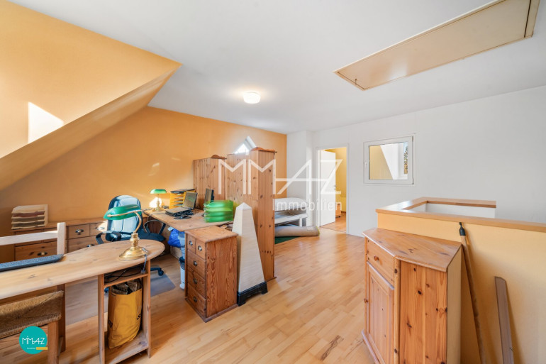 Das zweite Obergeschoss eröffnet mit einem großzügigen, offen gestalteten Raum vielfältige Nutzungsmöglichkeiten – ob als Homeoffice, Atelier, Spielzimmer oder zusätzlicher Wohnbereich. Ein weiteres Schlafzimmer sowie der Zugang zum Spitzdachboden bieten zusätzlichen Raum und Stauraum für persönliche Bedürfnisse.