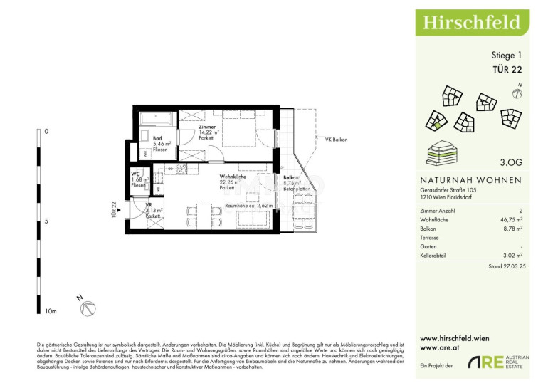 Naturnah und gut angebunden Hirschfeld ist ein beschauliches Viertel am Wiener Stadtrand. Die Metropole im Rücken verheißt jedem Nachhausekommen ein Naturerlebnis und Entspannung. Wer gerne mit den Wiener Linien unterwegs ist, nimmt am besten die Autobuslinie 32A ab Kollarzgasse bis zum U- und S-Bahn-Knotenpunkt Leopoldau. Von hier aus ermöglichen die U1 in Richtung Zentrum sowie die Schnellbahnlinien S1, S2 und S7 eine rasche Verbindung stadtein- und stadtauswärts. Alternativ verläuft die Straßenbahnlinie 31 entlang der Brünner Straße über Floridsdorf direkt bis Schottenring. Autofahrer profitieren von der nahegelegenen A22. Geschäfte des täglichen Bedarfs direkt ums Eck, das benachbarte Ella Lingens Gymnasium und die Nähe zum Marchfeldkanal sorgen für ein rundum ausgewogenes LebenBeschreibung der Immobilie