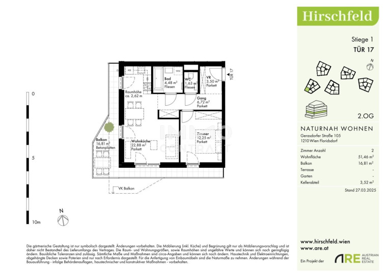 Naturnah und gut angebunden Hirschfeld ist ein beschauliches Viertel am Wiener Stadtrand. Die Metropole im Rücken verheißt jedem Nachhausekommen ein Naturerlebnis und Entspannung. Wer gerne mit den Wiener Linien unterwegs ist, nimmt am besten die Autobuslinie 32A ab Kollarzgasse bis zum U- und S-Bahn-Knotenpunkt Leopoldau. Von hier aus ermöglichen die U1 in Richtung Zentrum sowie die Schnellbahnlinien S1, S2 und S7 eine rasche Verbindung stadtein- und stadtauswärts. Alternativ verläuft die Straßenbahnlinie 31 entlang der Brünner Straße über Floridsdorf direkt bis Schottenring. Autofahrer profitieren von der nahegelegenen A22.Beschreibung der Immobilie