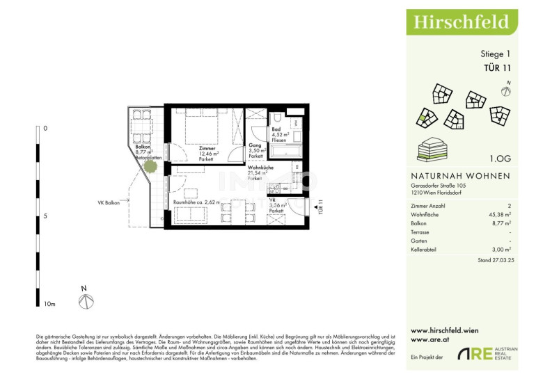 Naturnah und gut angebunden Hirschfeld ist ein beschauliches Viertel am Wiener Stadtrand. Die Metropole im Rücken verheißt jedem Nachhausekommen ein Naturerlebnis und Entspannung. Wer gerne mit den Wiener Linien unterwegs ist, nimmt am besten die Autobuslinie 32A ab Kollarzgasse bis zum U- und S-Bahn-Knotenpunkt Leopoldau. Von hier aus ermöglichen die U1 in Richtung Zentrum sowie die Schnellbahnlinien S1, S2 und S7 eine rasche Verbindung stadtein- und stadtauswärts. Alternativ verläuft die Straßenbahnlinie 31 entlang der Brünner Straße über Floridsdorf direkt bis Schottenring. Autofahrer profitieren von der nahegelegenen A22.Beschreibung der Immobilie