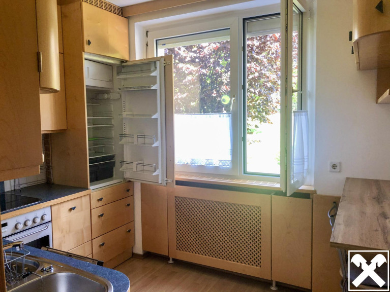 Die separate Küche bietet ausreichend Platz für Kochen und Stauraum.