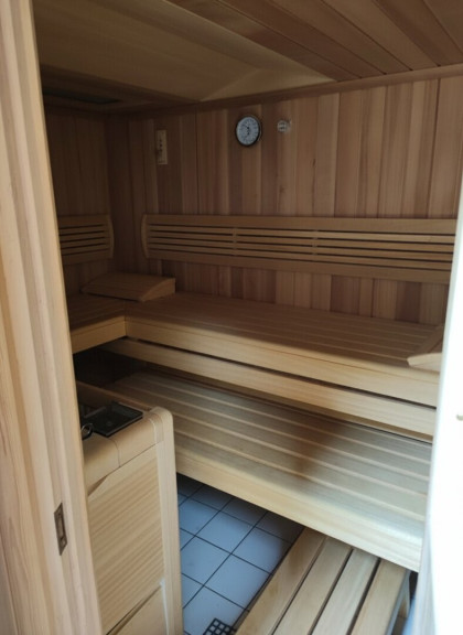 Fliesen, Laminatboden, Gas, Kamin, Zentralheizung, Bad mit Fenster, Badewanne, Dusche, Sauna