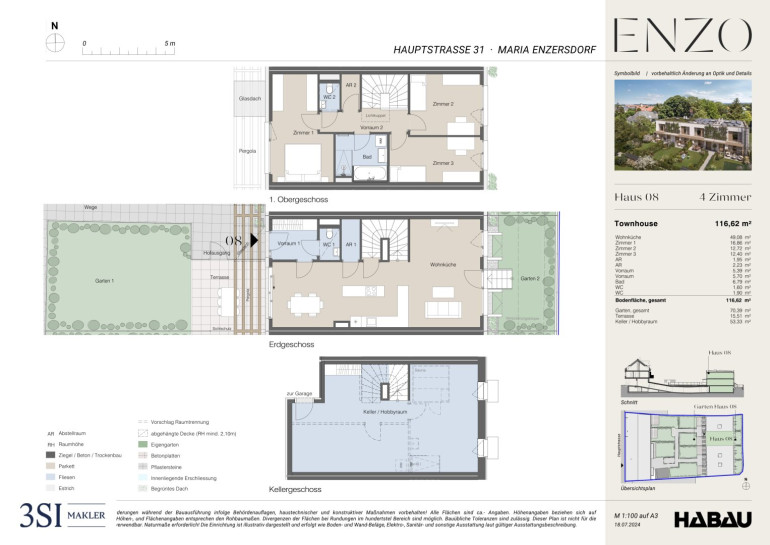 Dieses moderne Townhouse verfügt über 4 Zimmer und rund 117 m² Wohnfläche zzgl. rund 16 m² Terrassenfläche sowie zzgl. rund 69 m² Gartenfläche. Sie besticht durch ihren großzügigen Grundriss und teilt sich wie folgt auf: