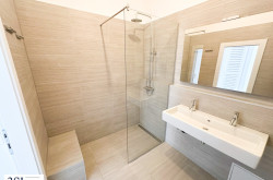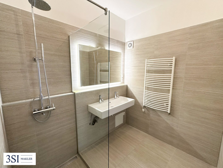 - Badezimmer mit Walk-In-Regendusche, Handtuchheizkörper und Doppelwaschbecken