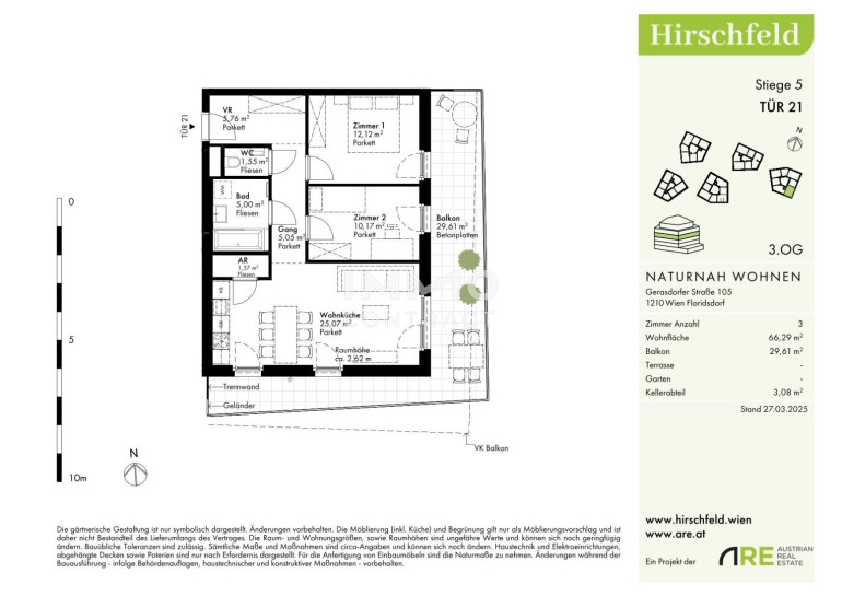 Naturnah und gut angebunden Hirschfeld ist ein beschauliches Viertel am Wiener Stadtrand. Die Metropole im Rücken verheißt jedem Nachhausekommen ein Naturerlebnis und Entspannung. Wer gerne mit den Wiener Linien unterwegs ist, nimmt am besten die Autobuslinie 32A ab Kollarzgasse bis zum U- und S-Bahn-Knotenpunkt Leopoldau. Von hier aus ermöglichen die U1 in Richtung Zentrum sowie die Schnellbahnlinien S1, S2 und S7 eine rasche Verbindung stadtein- und stadtauswärts. Alternativ verläuft die Straßenbahnlinie 31 entlang der Brünner Straße über Floridsdorf direkt bis Schottenring. Autofahrer profitieren von der nahegelegenen A22.Beschreibung der Immobilie