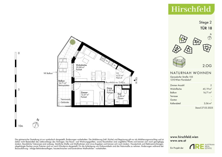 Naturnah und gut angebunden Hirschfeld ist ein beschauliches Viertel am Wiener Stadtrand. Die Metropole im Rücken verheißt jedem Nachhausekommen ein Naturerlebnis und Entspannung. Wer gerne mit den Wiener Linien unterwegs ist, nimmt am besten die Autobuslinie 32A ab Kollarzgasse bis zum U- und S-Bahn-Knotenpunkt Leopoldau. Von hier aus ermöglichen die U1 in Richtung Zentrum sowie die Schnellbahnlinien S1, S2 und S7 eine rasche Verbindung stadtein- und stadtauswärts. Alternativ verläuft die Straßenbahnlinie 31 entlang der Brünner Straße über Floridsdorf direkt bis Schottenring. Autofahrer profitieren von der nahegelegenen A22.Beschreibung der Immobilie