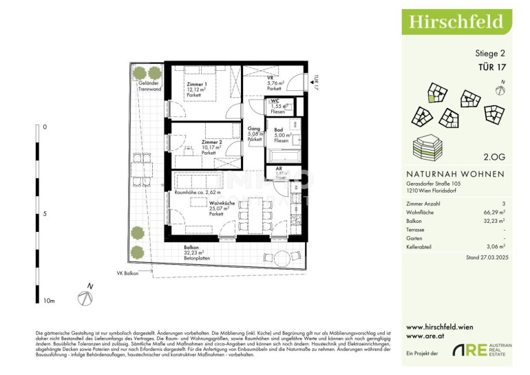 Naturnah und gut angebunden Hirschfeld ist ein beschauliches Viertel am Wiener Stadtrand. Die Metropole im Rücken verheißt jedem Nachhausekommen ein Naturerlebnis und Entspannung. Wer gerne mit den Wiener Linien unterwegs ist, nimmt am besten die Autobuslinie 32A ab Kollarzgasse bis zum U- und S-Bahn-Knotenpunkt Leopoldau. Von hier aus ermöglichen die U1 in Richtung Zentrum sowie die Schnellbahnlinien S1, S2 und S7 eine rasche Verbindung stadtein- und stadtauswärts. Alternativ verläuft die Straßenbahnlinie 31 entlang der Brünner Straße über Floridsdorf direkt bis Schottenring. Autofahrer profitieren von der nahegelegenen A22.Beschreibung der Immobilie