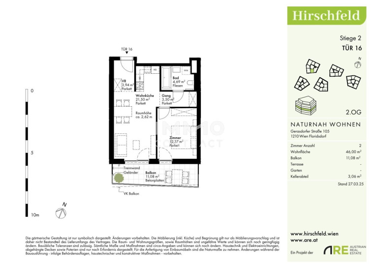 Naturnah und gut angebunden Hirschfeld ist ein beschauliches Viertel am Wiener Stadtrand. Die Metropole im Rücken verheißt jedem Nachhausekommen ein Naturerlebnis und Entspannung. Wer gerne mit den Wiener Linien unterwegs ist, nimmt am besten die Autobuslinie 32A ab Kollarzgasse bis zum U- und S-Bahn-Knotenpunkt Leopoldau. Von hier aus ermöglichen die U1 in Richtung Zentrum sowie die Schnellbahnlinien S1, S2 und S7 eine rasche Verbindung stadtein- und stadtauswärts. Alternativ verläuft die Straßenbahnlinie 31 entlang der Brünner Straße über Floridsdorf direkt bis Schottenring. Autofahrer profitieren von der nahegelegenen A22.Beschreibung der Immobilie