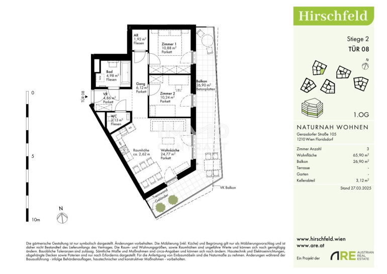 Naturnah und gut angebunden Hirschfeld ist ein beschauliches Viertel am Wiener Stadtrand. Die Metropole im Rücken verheißt jedem Nachhausekommen ein Naturerlebnis und Entspannung. Wer gerne mit den Wiener Linien unterwegs ist, nimmt am besten die Autobuslinie 32A ab Kollarzgasse bis zum U- und S-Bahn-Knotenpunkt Leopoldau. Von hier aus ermöglichen die U1 in Richtung Zentrum sowie die Schnellbahnlinien S1, S2 und S7 eine rasche Verbindung stadtein- und stadtauswärts. Alternativ verläuft die Straßenbahnlinie 31 entlang der Brünner Straße über Floridsdorf direkt bis Schottenring. Autofahrer profitieren von der nahegelegenen A22.Beschreibung der Immobilie