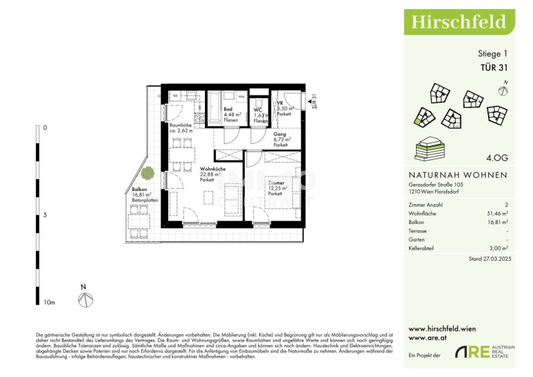 Naturnah und gut angebunden Hirschfeld ist ein beschauliches Viertel am Wiener Stadtrand. Die Metropole im Rücken verheißt jedem Nachhausekommen ein Naturerlebnis und Entspannung. Wer gerne mit den Wiener Linien unterwegs ist, nimmt am besten die Autobuslinie 32A ab Kollarzgasse bis zum U- und S-Bahn-Knotenpunkt Leopoldau. Von hier aus ermöglichen die U1 in Richtung Zentrum sowie die Schnellbahnlinien S1, S2 und S7 eine rasche Verbindung stadtein- und stadtauswärts. Alternativ verläuft die Straßenbahnlinie 31 entlang der Brünner Straße über Floridsdorf direkt bis Schottenring. Autofahrer profitieren von der nahegelegenen A22.Beschreibung der Immobilie