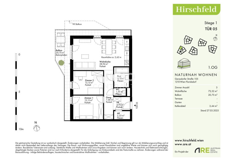 Diese ca. 73 m² große Wohnung bietet ein durchdachtes Raumkonzept mit drei Zimmern, einer großzügigen Wohnküche mit Blick ins Grüne sowie einem separat begehbaren Badezimmer und WC. Highlight ist der rund 20 m² große Balkon, der viel Platz für entspannte Stunden im Freien bietet und den Wohnkomfort perfekt abrundet.