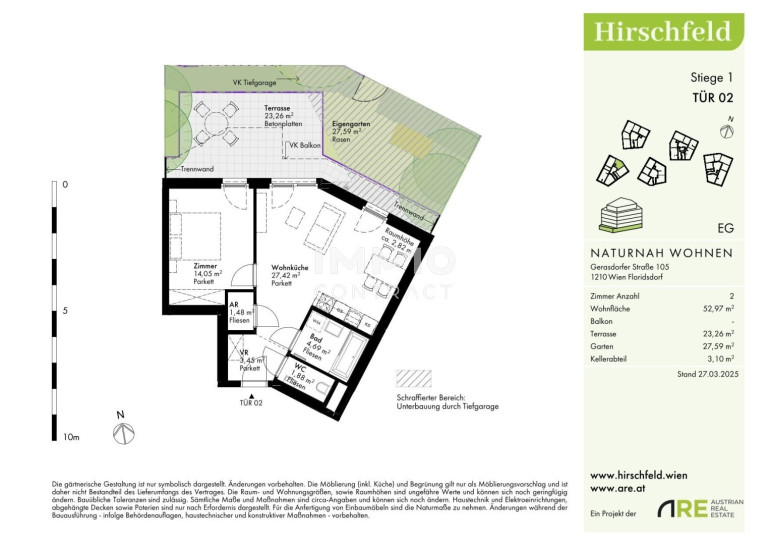 Naturnah und gut angebunden Hirschfeld ist ein beschauliches Viertel am Wiener Stadtrand. Die Metropole im Rücken verheißt jedem Nachhausekommen ein Naturerlebnis und Entspannung. Wer gerne mit den Wiener Linien unterwegs ist, nimmt am besten die Autobuslinie 32A ab Kollarzgasse bis zum U- und S-Bahn-Knotenpunkt Leopoldau. Von hier aus ermöglichen die U1 in Richtung Zentrum sowie die Schnellbahnlinien S1, S2 und S7 eine rasche Verbindung stadtein- und stadtauswärts. Alternativ verläuft die Straßenbahnlinie 31 entlang der Brünner Straße über Floridsdorf direkt bis Schottenring. Autofahrer profitieren von der nahegelegenen A22.Beschreibung der Immobilie