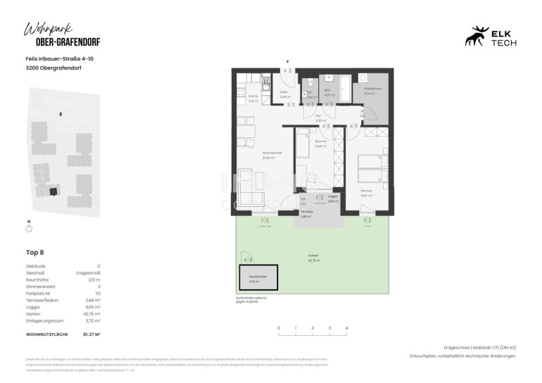 Der attraktive Wohnpark befindet sich im malerischen Ort Ober-Grafendorf, eingebettet in die reizvolle Landschaft Niederösterreichs. Die Region überzeugt durch ihre harmonische Mischung aus ländlicher Idylle und urbanem Komfort. Hier genießen Sie die Ruhe der Natur, ohne auf die Vorzüge städtischer Annehmlichkeiten verzichten zu müssen. In der unmittelbaren Umgebung finden Sie eine gute Infrastruktur mit Einkaufsmöglichkeiten, Restaurants und Cafés, die den täglichen Bedarf decken. Dank der Nähe zu Schulen und Kindergärten eignet sich die Lage ideal für Familien. Darüber hinaus besticht der Ort durch seine hervorragenden Verkehrsanbindungen an die umliegenden Städte, was Pendlern ein entspanntes Erreichen ihres Arbeitsplatzes ermöglicht. Freizeitliebhaber schätzen die zahlreichen Naherholungsgebiete insbesondere den Ebersdorfer See, die zu ausgedehnten Spaziergängen und sportlichen Aktivitäten einladen. Kulturfreunde kommen ebenfalls auf ihre Kosten, da die Region reich an kulturellen Veranstaltungen und historischen Sehenswürdigkeiten ist.Beschreibung der Immobilie