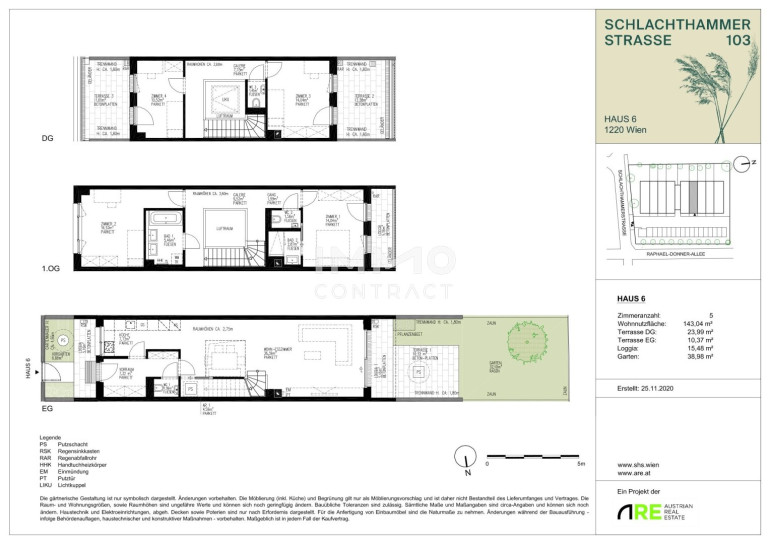 Die Reihenhäuser sind jeweils 3-geschoßig und haben Wohnnutzflächen von ca. 143 m². Das Haus hat in den beiden Obergeschoßen 4 Schlafzimmer und im Erdgeschoß den Bereich für Kochen, Essen und Wohnen. In jedem der drei Stockwerke gibt es Freiflächen - zwei Loggien, drei Terrassen, einen Eigengarten und einen Vorgarten.