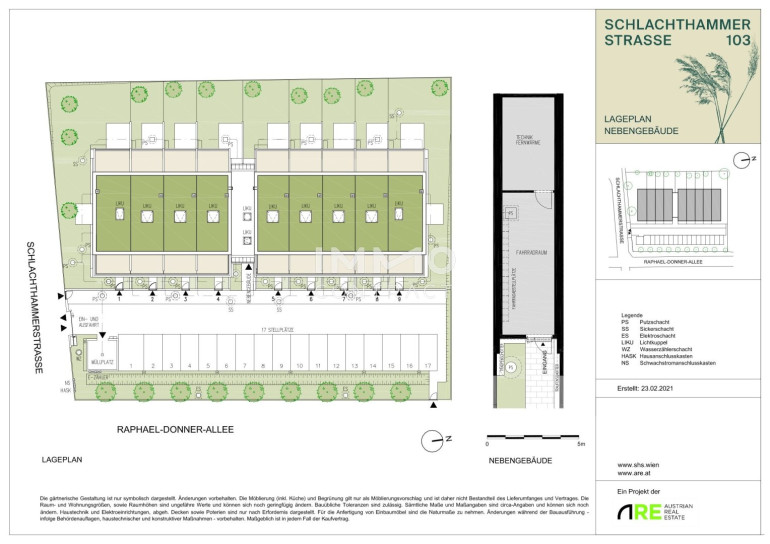 Das Projekt in der Schlachthammerstraße liegt in Essling östlich des Wiener Stadtzentrums, zwischen Aspern und der Seestadt, Hirschstetten und dem Marchfeld. Die Buslinie 98A fährt direkt zur U2, und auch die Buslinien 26A, 88A, 88B und N26 sind in wenigen Minuten zu Fuß erreichbar. Darüber hinaus führt ein durchgehender Radweg mit einer Fahrzeit von etwa 30 Minuten ins Stadtzentrum: durch die Lobau und über die Donauinsel, durch den Prater und die Donaulände entlang. Zu Fuß ist der Nationalpark Donau-Auen rund 15 Minuten entfernt.Beschreibung der Immobilie