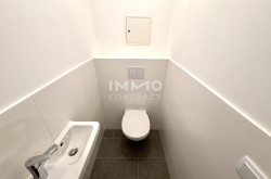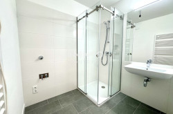 Das Badezimmer ist mit einer bodenebenen Dusche ausgestattet und modern verfliest.