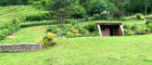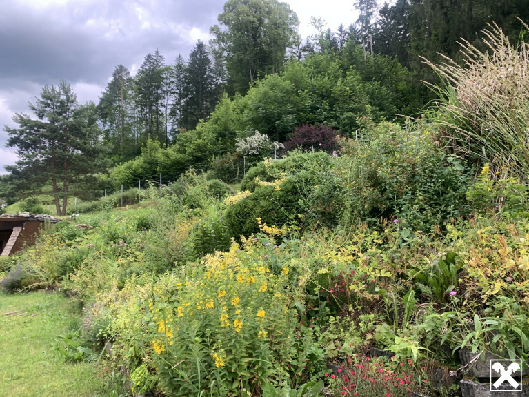 Zur Lagerung bieten sich die Gartenhütte und der gemauerte Abstellraum an.