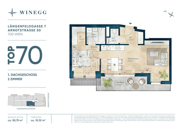 Ein besonderes Augenmerk wurde auf Freiflächen gelegt: Alle Wohnungen verfügen über Loggien, Balkone, Terrassen oder Eigengärten, die den Wohnraum ins Freie erweitern. Die beiden Dachgeschoßwohnungen setzen dem Projekt die Krone auf und bieten großzügige private Dachterrassen mit besonderem Wohnkomfort – ideal für anspruchsvolle Käufer, die das Besondere suchen.