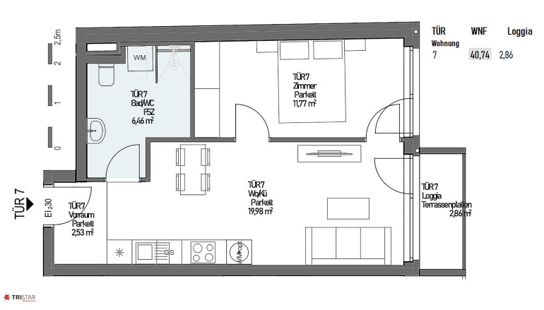 Top 7: WNFL ca. 41 m² (2 Zimmer) + Loggia ca. 3 m² + ER (Keller) ca. 2 m² - Reserviert
