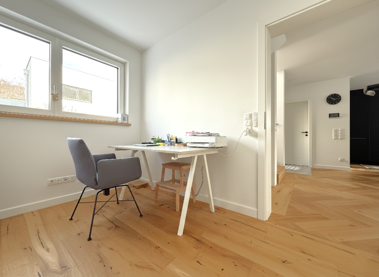 Auf rund 111,91 m² Wohnfläche, verteilt auf zwei Wohnebenen, bietet das Haus ideale Voraussetzungen für das Familienleben. Im Erdgeschoss bildet der offen gestaltete Wohn- und Essbereich das Herzstück des Hauses. Von hier aus gelangen Sie direkt auf die sonnige Terrasse (ca. 15,75 m²) und in den Garten mit ca. 55 m² – ein geschützter Platz zum Spielen, Entspannen und Zusammensein. Ein zusätzliches Zimmer, derzeit als Büro genutzt, lässt sich flexibel als Kinder- oder Gästezimmer verwenden. Ein Gäste-WC ergänzt diese Ebene sinnvoll.